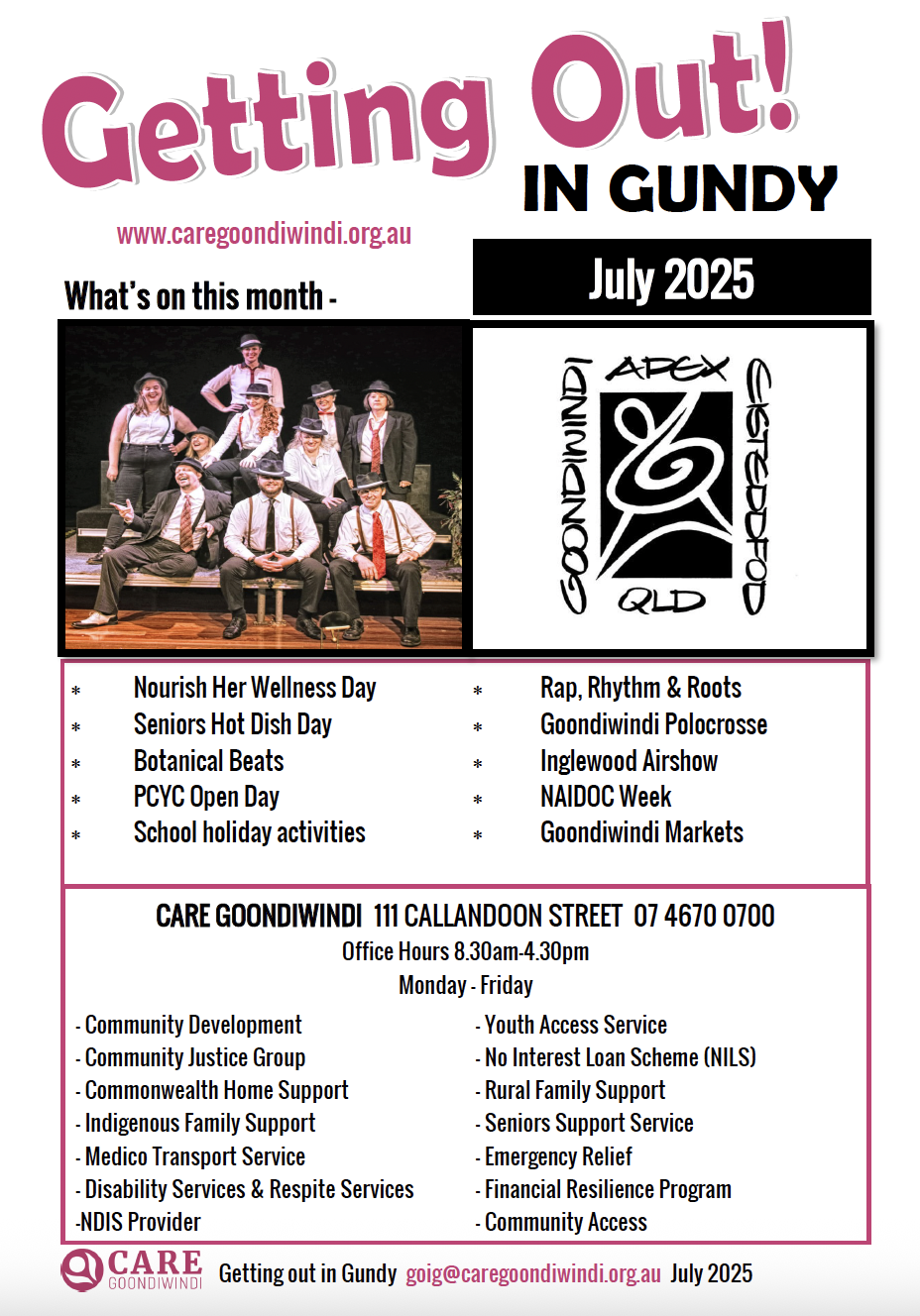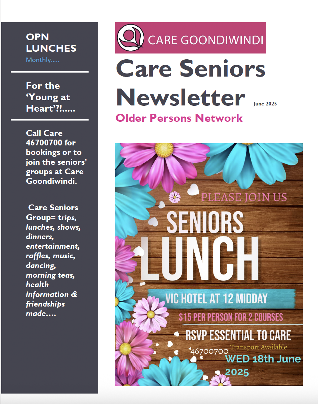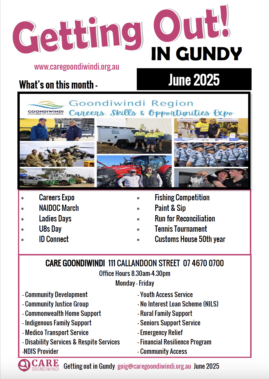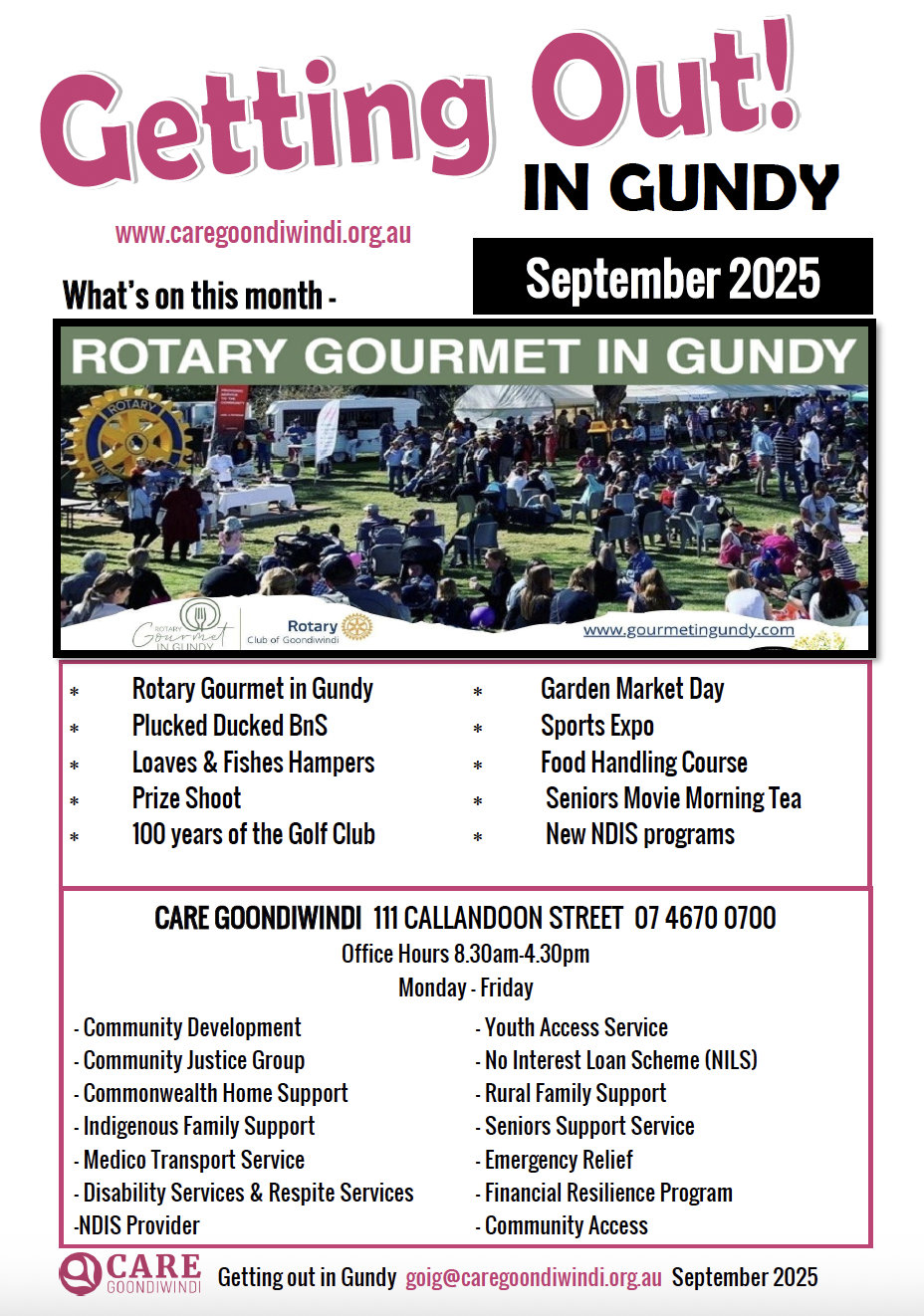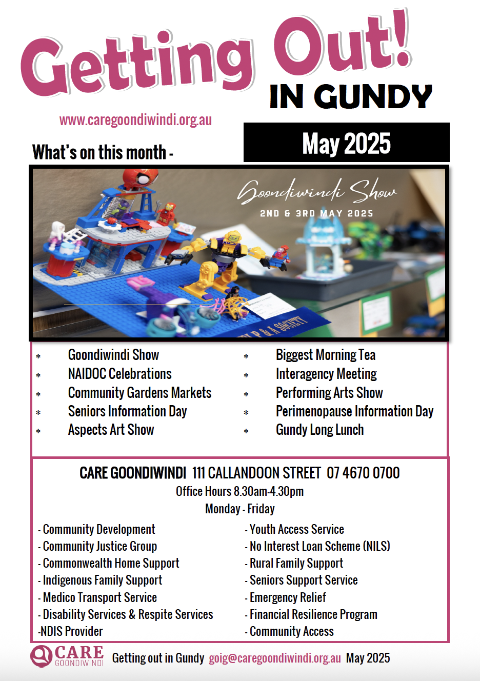 News Getting Out In Gundy March 2025 April 2025 May 2025 June 2025 July 2025 Aug 2025 Sept 2025 Seniors Newsletter April2025 MAY 2025 JUNE 2025 JULY 2025 AUG 2025 SEPT 2025 Articles ANNUAL GENERAL MEETING September 21, 2025 Read More » Care Goondiwindi pleased to support Loaves & Fishes Care Services Toowoomba June 26, 2025 Read More » Australia’s Biggest Morning Tea May 7, 2025 Read More » 2024 – A Year in Pictures February 6, 2025 Read More » Disability Group Halloween Disco 2024 November 29, 2024 Read More » Torvill & Dean Expressions of Interest November 29, 2024 Read More » Page1 Page2 Page3 Page4 Page5