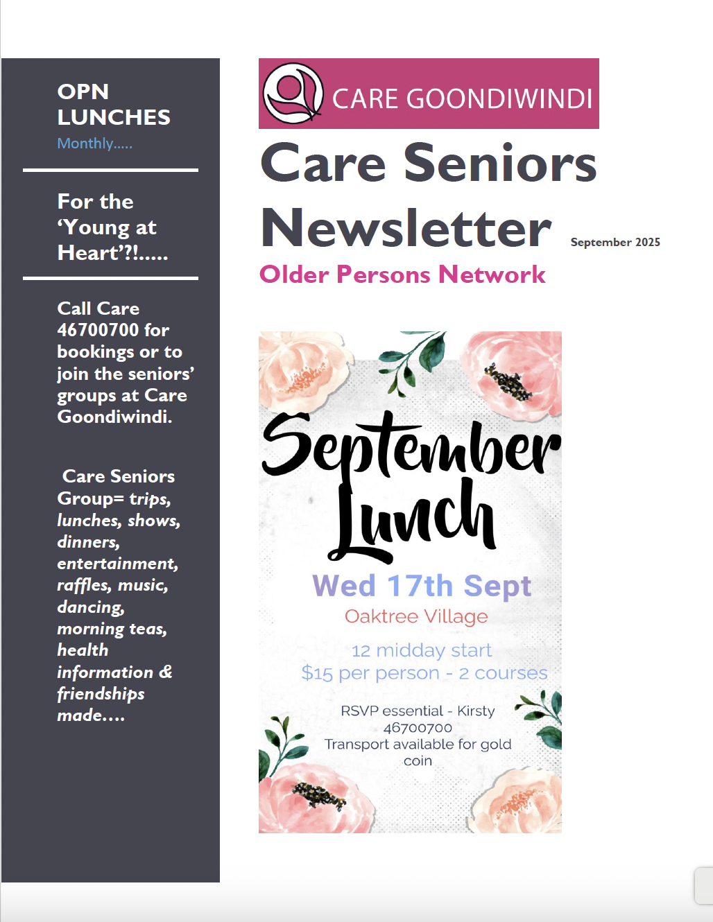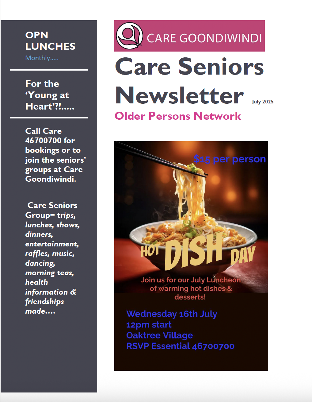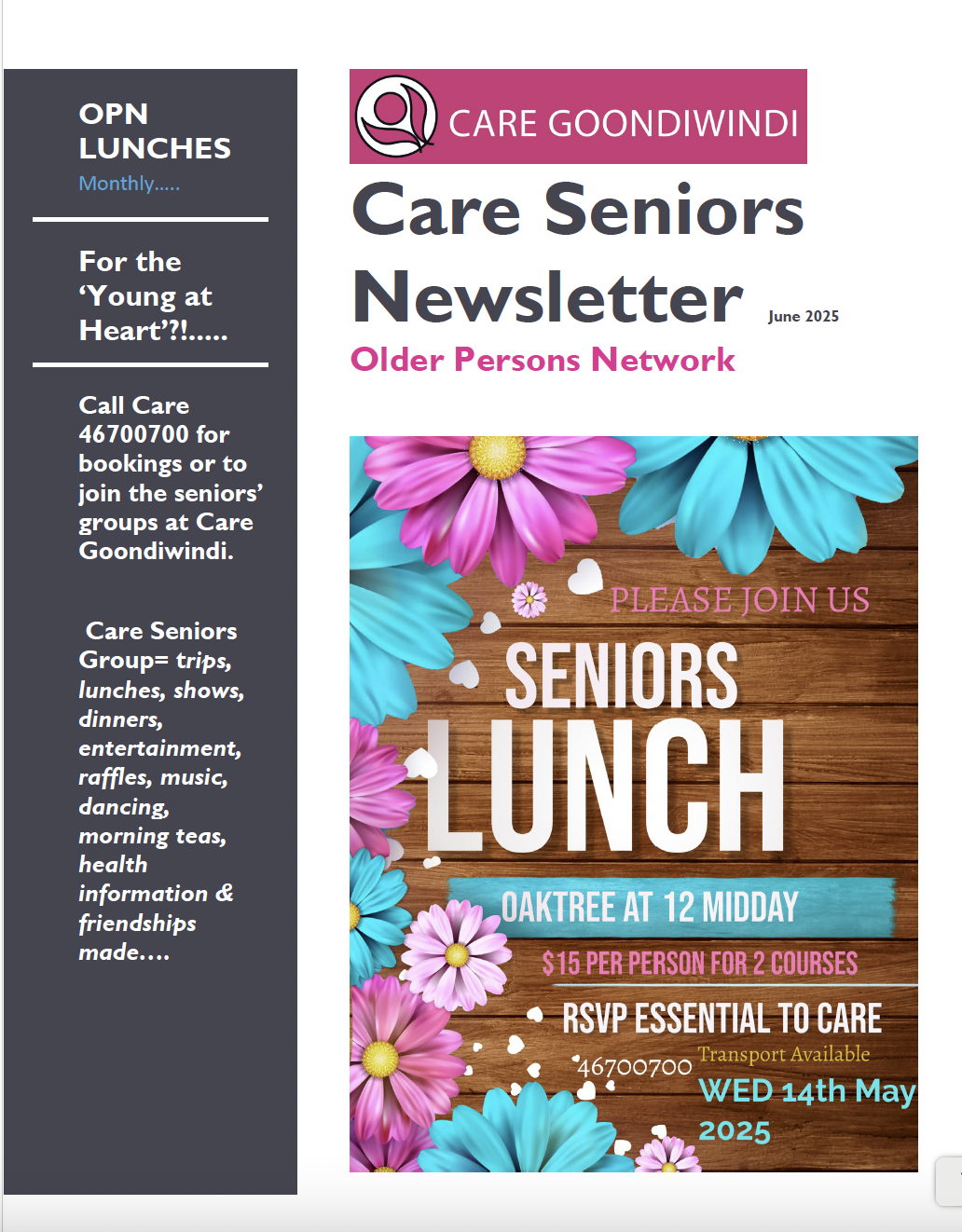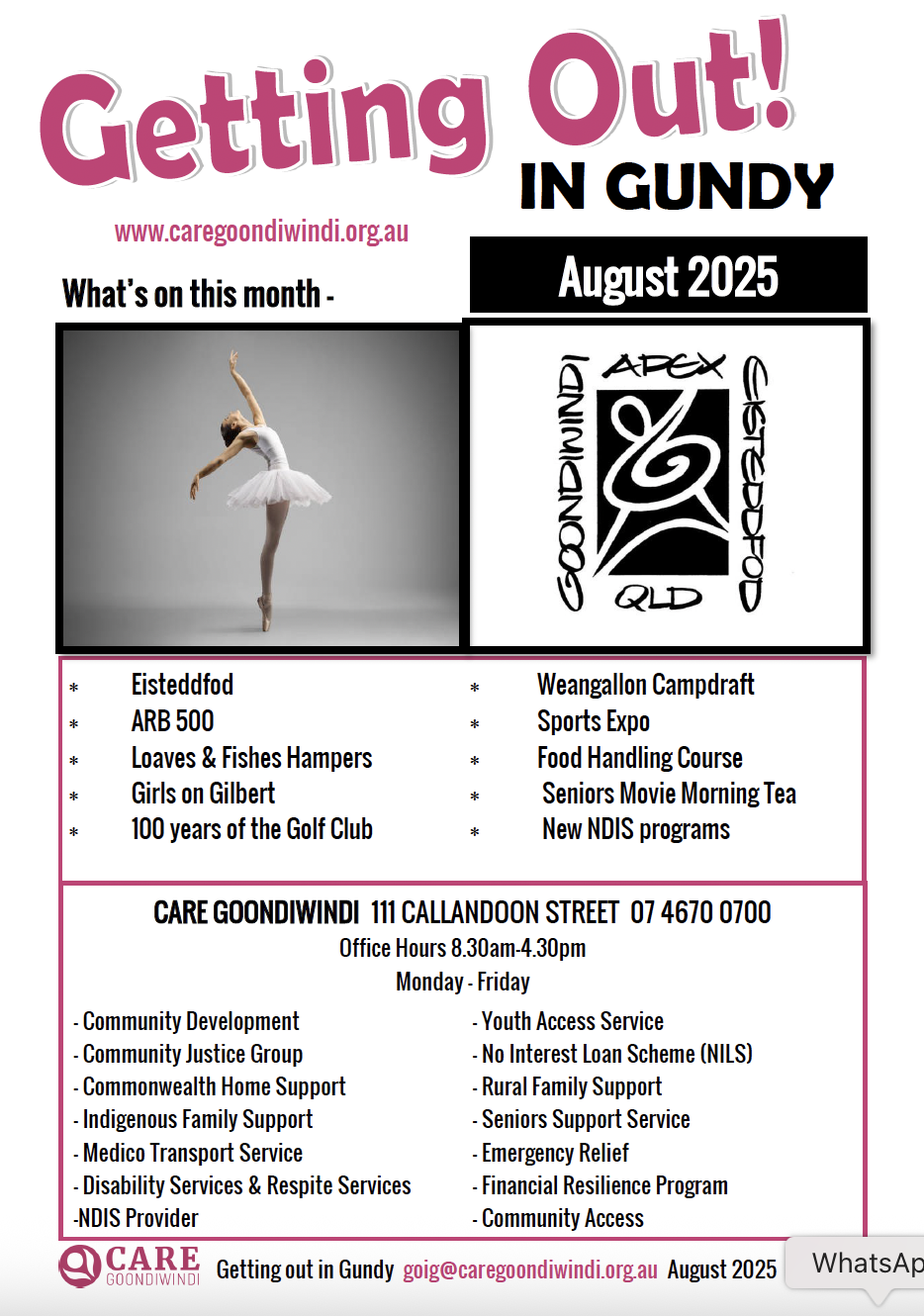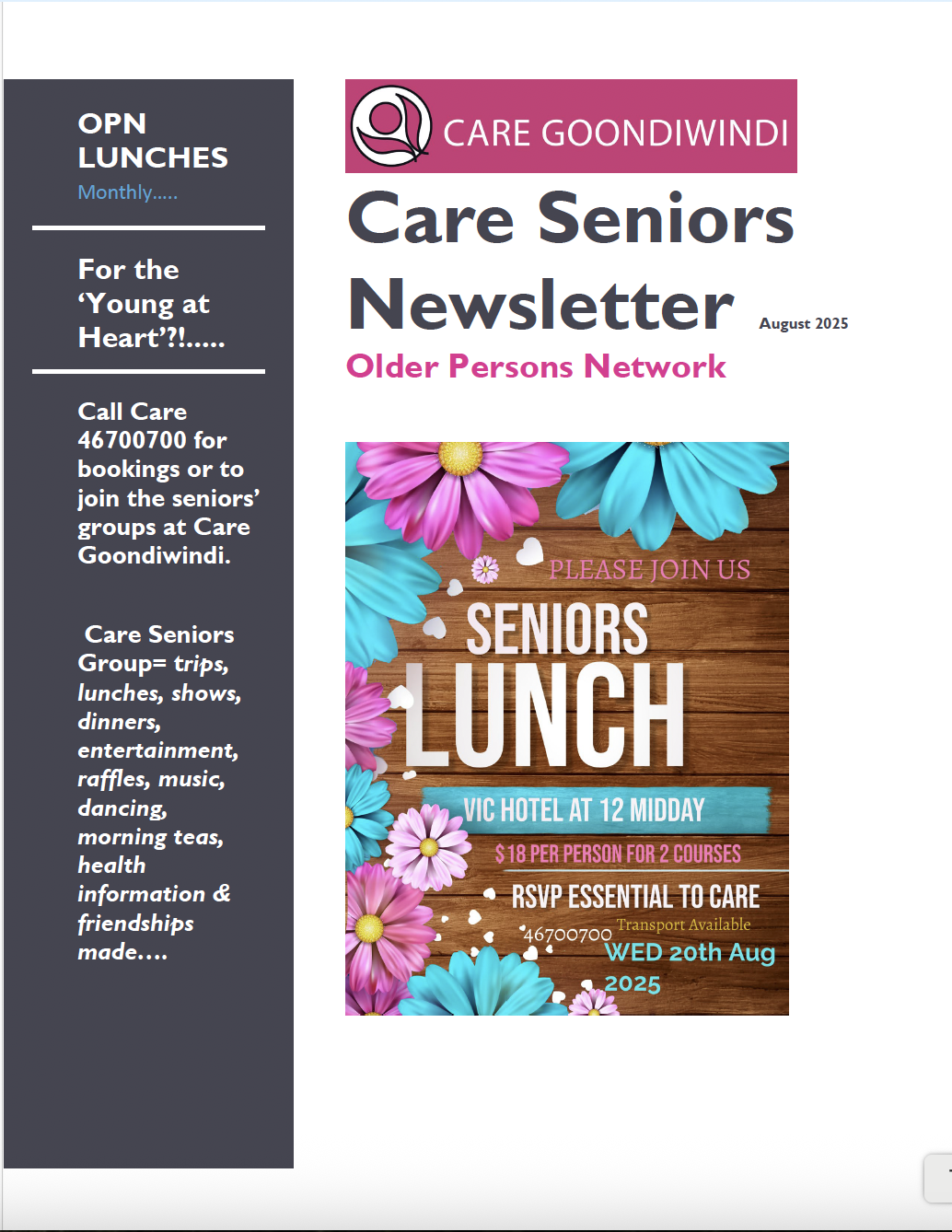 News Getting Out In Gundy March 2025 April 2025 May 2025 June 2025 July 2025 Aug 2025 Sept 2025 Seniors Newsletter April2025 MAY 2025 JUNE 2025 JULY 2025 AUG 2025 SEPT 2025 Articles ANNUAL GENERAL MEETING September 21, 2025 Read More » Care Goondiwindi pleased to support Loaves & Fishes Care Services Toowoomba June 26, 2025 Read More » Australia’s Biggest Morning Tea May 7, 2025 Read More » 2024 – A Year in Pictures February 6, 2025 Read More » Disability Group Halloween Disco 2024 November 29, 2024 Read More » Torvill & Dean Expressions of Interest November 29, 2024 Read More » Page1 Page2 Page3 Page4 Page5